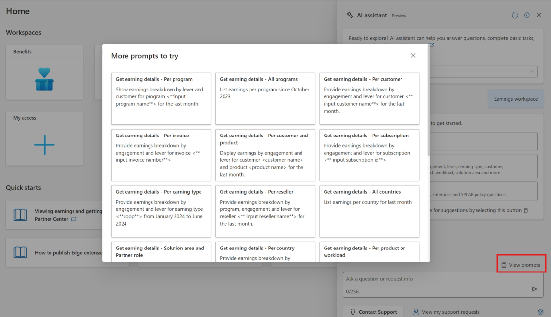 Within the AI assistant panel, there's a prompt guide to help you explore the capabilities within each Partner Center workspace. When you select the View prompts button above the chat field box, you can view suggested prompts.