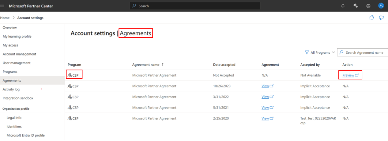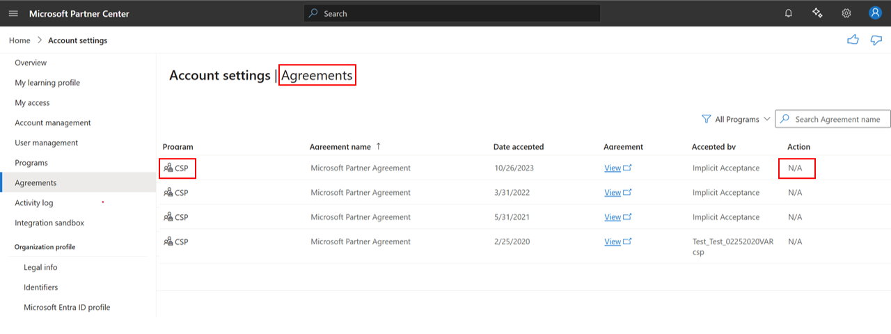 7. If you previously moved to Partner Center as a CSP partner, accept the Microsoft Partner Agreement on the Agreements page using Global admin credentials. You can confirm that the Microsoft Partner Agreement is signed from Legal profile Program info or by searching for the Microsoft Partner Agreement in the Agreements page.