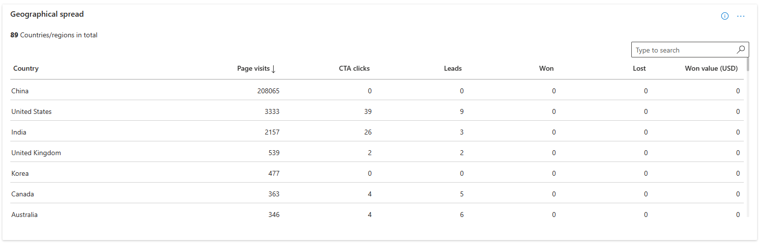This section shows the countries/regions where deals came from, along with details for each country/region. There's a table view of the deal details for each country/region.