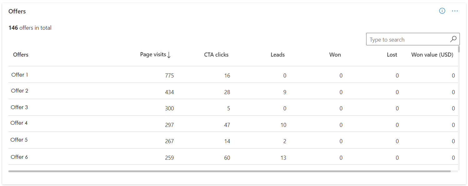 This widget is available under the Marketplace leads tab. You can view the insights against offers published in marketplace.