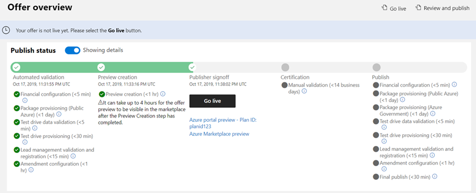 The following screenshot shows the Offer overview page for an offer, with two preview links under the Go live button. The validation steps you'll see on this page vary depending on the selections you made when you created the offer.
