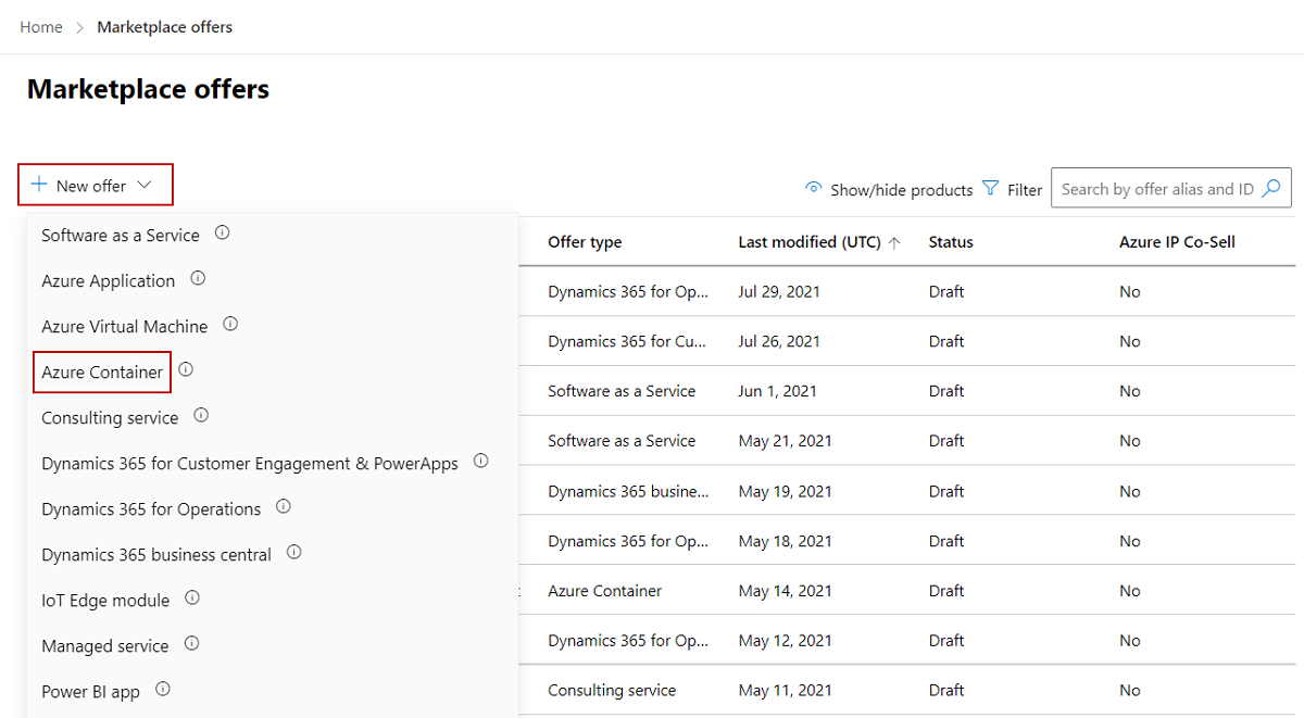 On the Marketplace offers page, select + New offer > Azure Container.