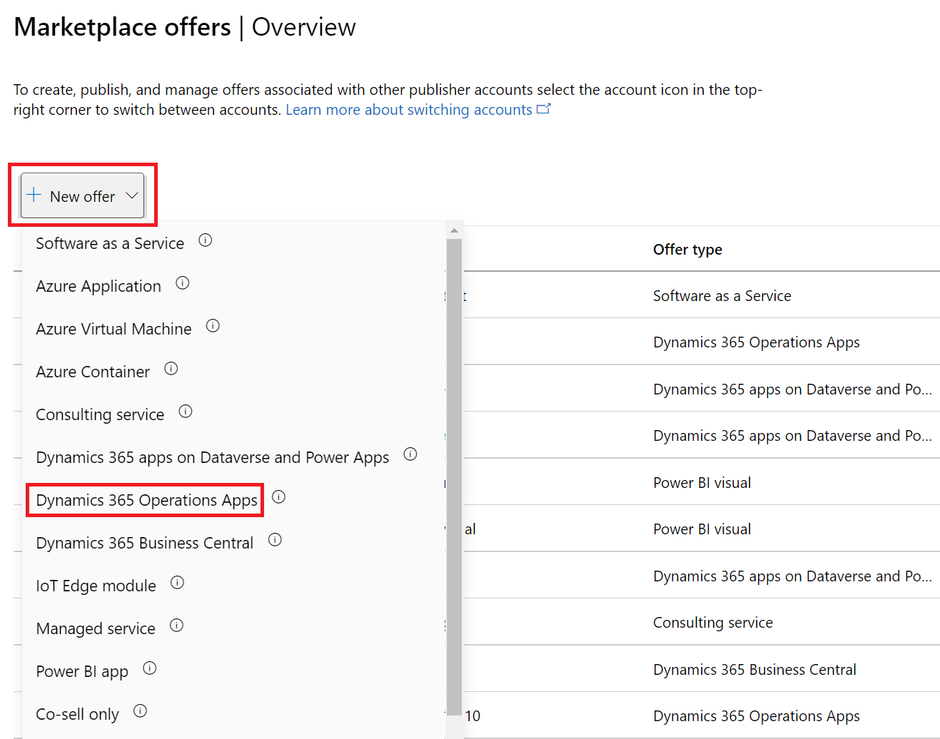 On the Marketplace offers page, select + New offer > Dynamics 365 Operations Apps.