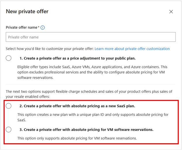 ISV partners can use a discounted price to provide a percentage-based discount on top of a publicly listed plan. You can use it only when the private price is lower than the publicly listed plan price. You can use the absolute price to specify a price point higher, lower, or equal to the publicly listed plan price. The price can be applied only at a plan level. You can apply an absolute price to virtual machine software reservation offers but not for virtual machine offers or any plans that have a trial enabled.