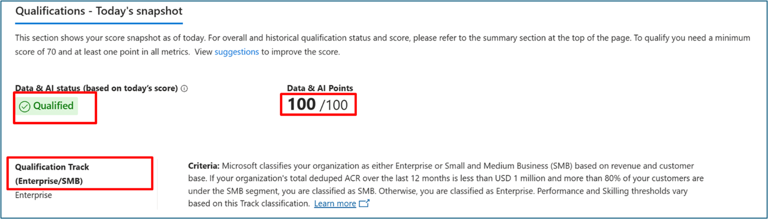 The Enrollment track signifies your enrollment into this solution area. The Enrollment track is visible only if you're enrolled in that solution area. Once your organization enrolls in this solution area, the Enrollment Track remains unchanged for one year until the next renewal. The Enrollment track is computed as SMB, if you qualified as SMB at least once during the qualification eligibility window. In the scores history panel, you should have at least one SMB in the six rows. If your organization qualifies as Enterprise all throughout the qualification eligibility window, the Enrollment track computes as Enterprise.
