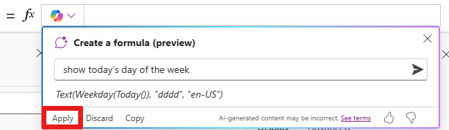 Copilot can generate Power Fx formulas from code comments in the formula bar. You can accept the suggestion or type the formula yourself. Formula code comments can also serve as documentation for your formulas, just like regular code comments.