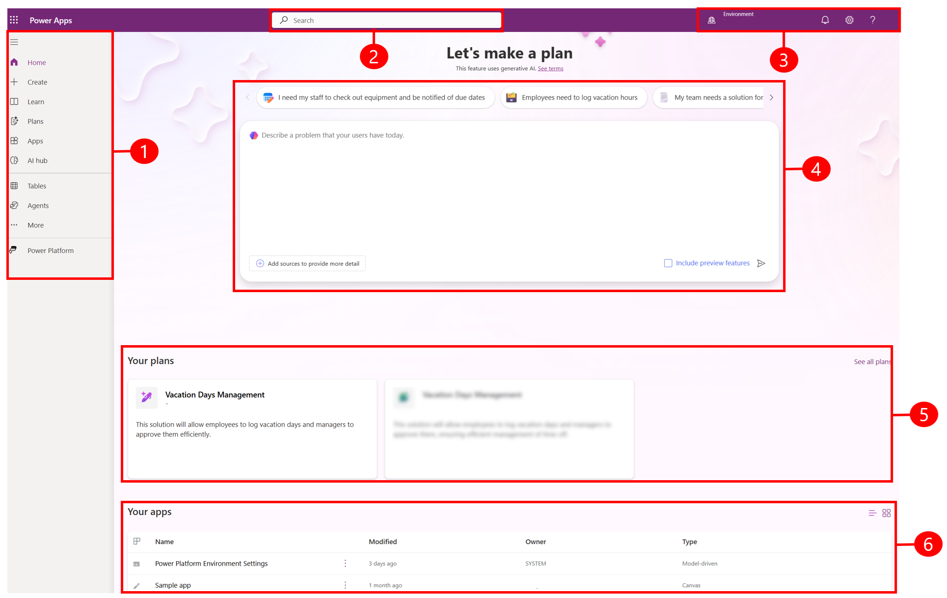 - Create: Create apps as such as canvas apps, model-driven apps, chatbots, and AI models.
