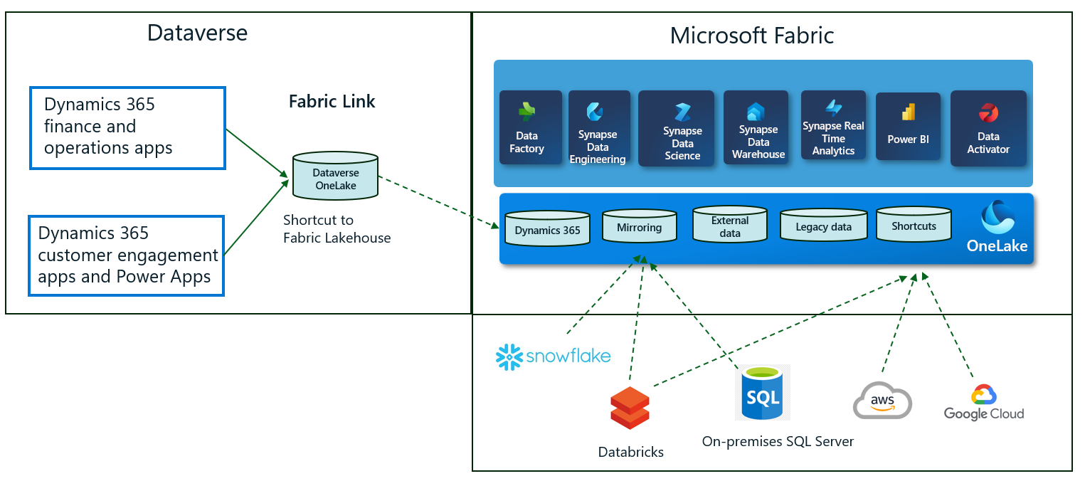 - Dataverse comes with a built-in OneLake store. Operational data from Dynamics 365 and Power Apps are replicated to built-in lake store near real-time (to avoid influence to operational workloads) and linked securely to Fabric via shortcuts. There's no need to bring Azure storage and secure data that’s exported out. Your data doesn’t leave the Dataverse governance boundary and authorized users in Fabric can work with data using all Fabric workloads.