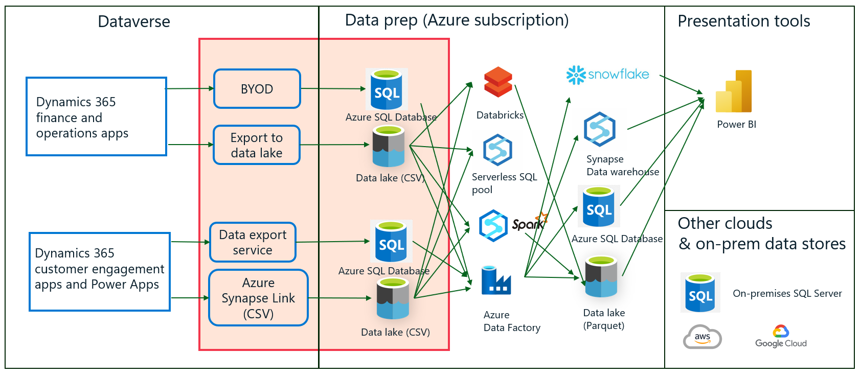 If you're a customer using legacy services BYOD, data export service, or Export to Data lake, you might have a data integration architecture similar to the one shown here. The highlighted box indicates the data pipelines your organization might have built to leverage the data exported from Dynamics 365 and Dataverse. You can use a selection of tools from Microsoft, as well as others, to copy and integrate Dynamics data with your own data. You can also transform and aggregate data by copying into multiple stores – shown in the data prep box of the diagram. You can use Power BI or another tool to visualize data and create actionable insights. You might have pipelines built to export data to an on-premises system and other clouds.