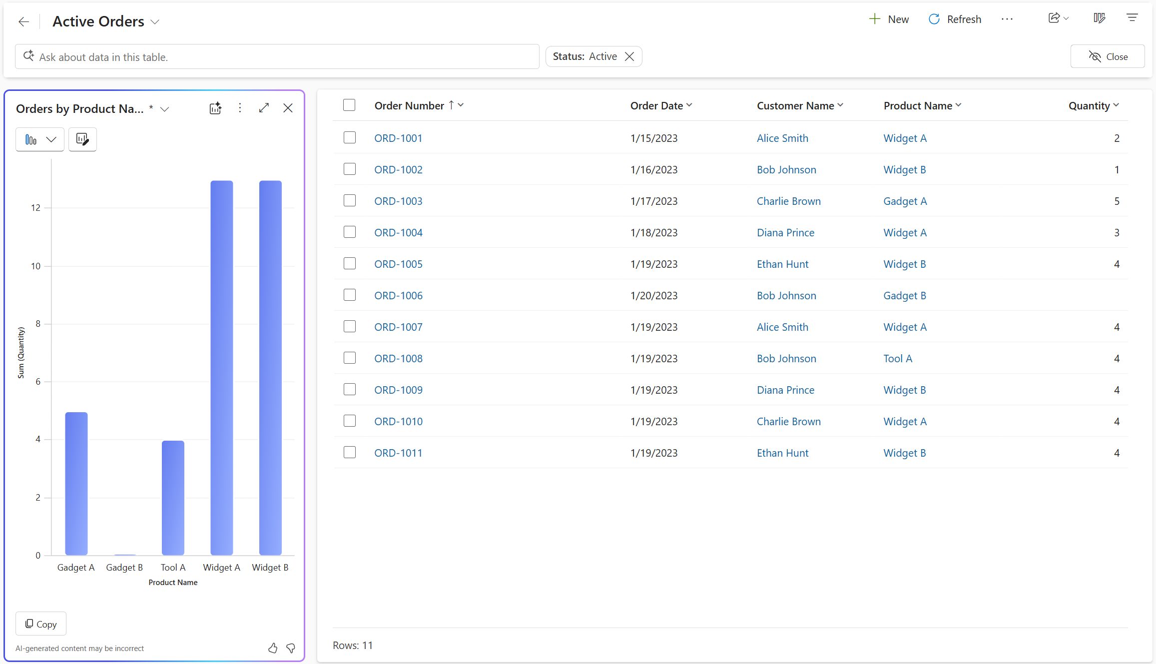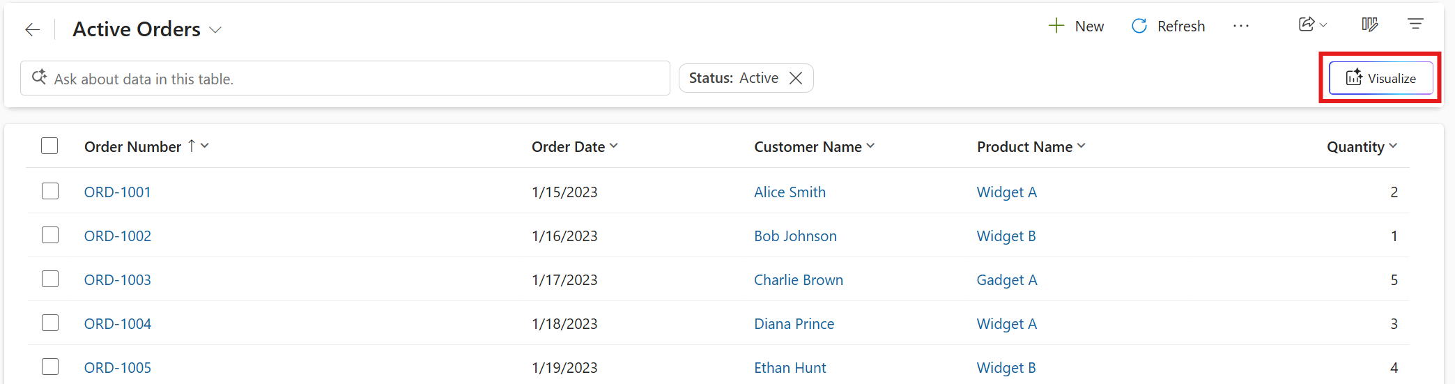 When you select Visualize, the chart pane opens next to the grid, complementing the table of rows. If the table has system or personal charts, the default chart for the table is shown. If the table doesn't have charts, Copilot generates a visualization for the view based on the visible columns and filters. The visualization is a chart that aggregates the data in the view.