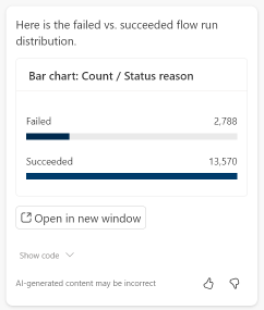 You can influence Copilot's output format by asking for explicit output types like "show me failed vs succeeded flow run distribution as a bar chart." This prompt likely produces the following outcome: