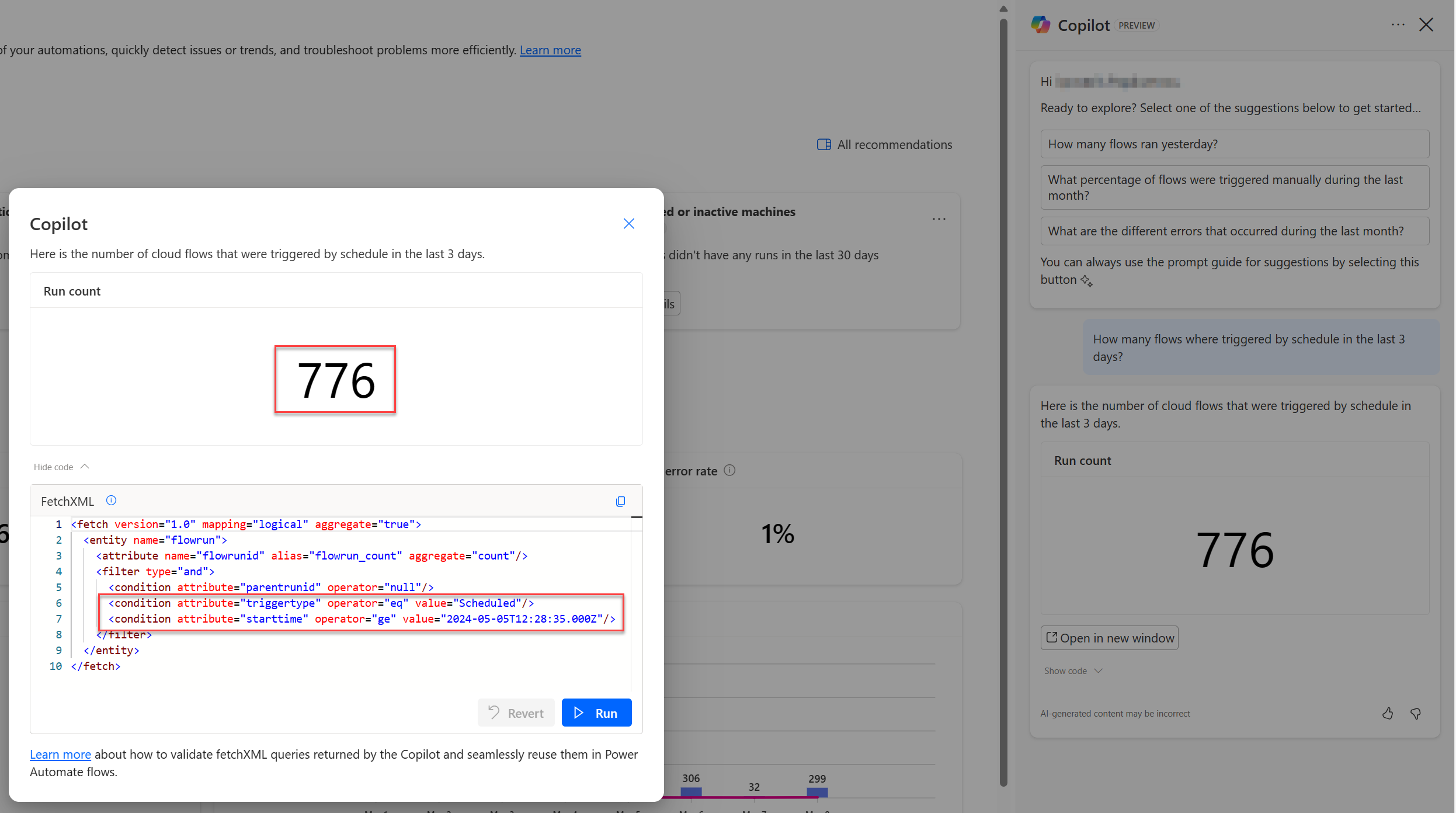 Let's assume you asked Copilot 'how many failed vs succeeded flows did we have last month?' This prompt produces a FetchXML query similar to the following example: