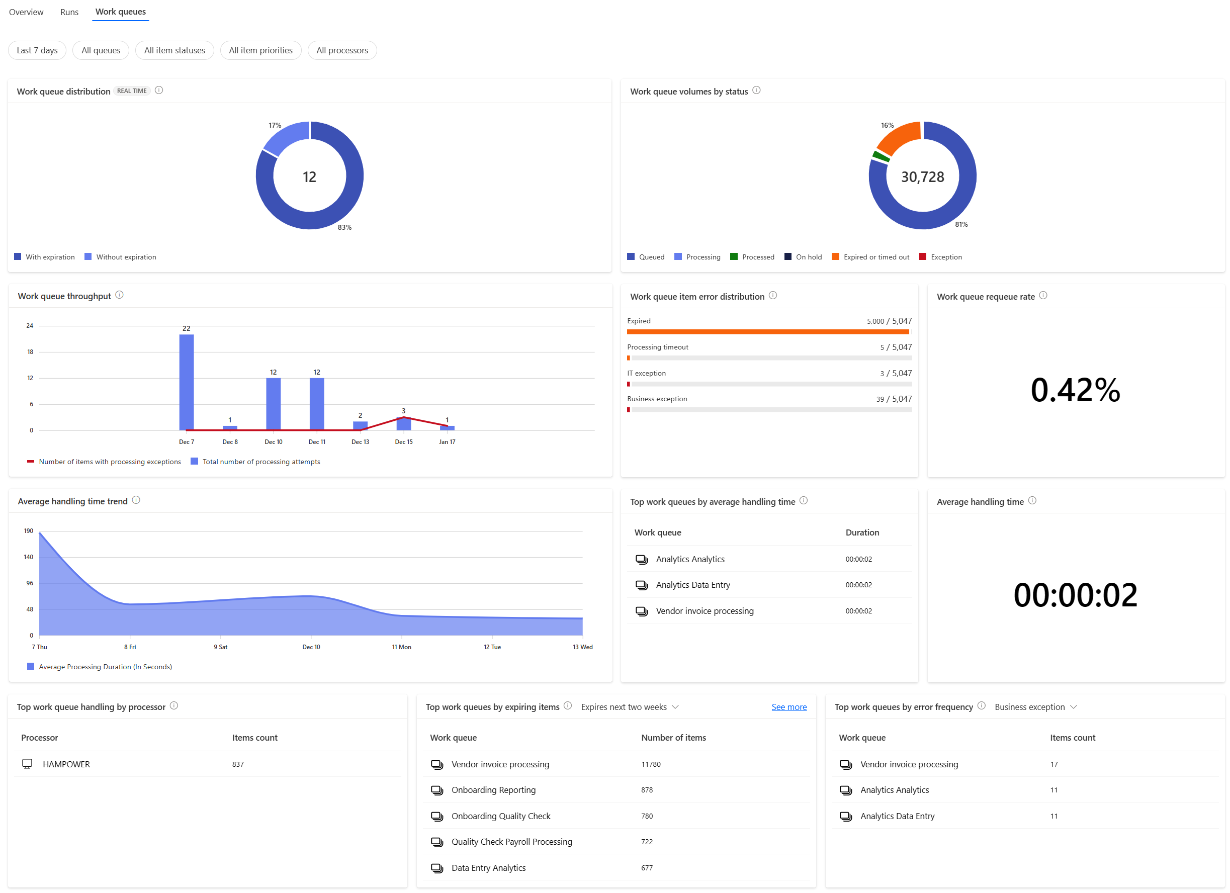 This tab provides metrics to monitor the health status of work queue items, including throughput, average handling time, and distribution. These metrics help to identify areas for improvement and track performance over time.