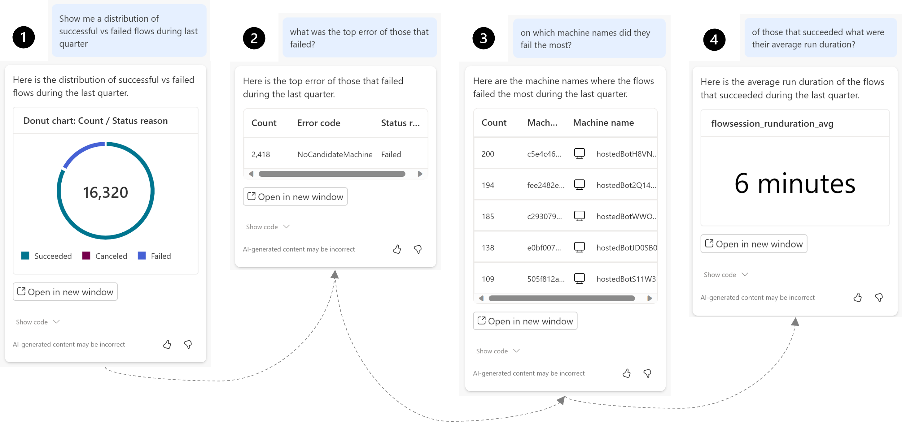 This copilot experience is powered by the Azure OpenAI service and is capable of translating user prompts into valid Dataverse FetchXML queries. Initially, these queries are focused on and optimized for desktop flow activity, such as runs, flows, errors, and machines.