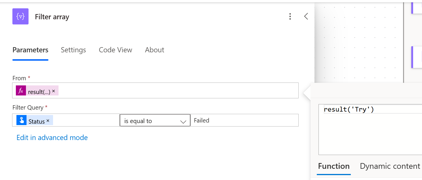 In this example, the Filter array action filters the response from the result() function to get the error.