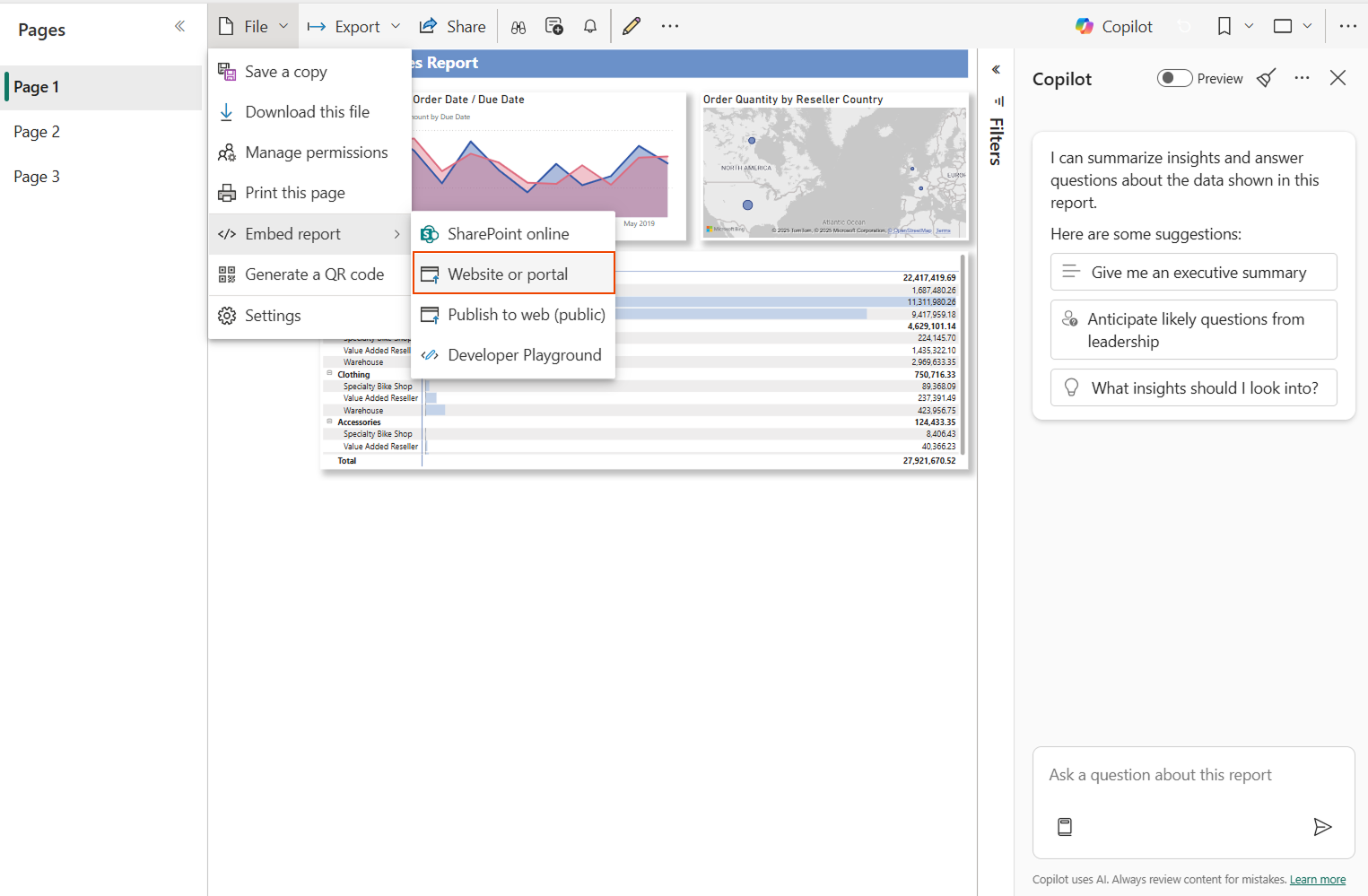 On the File menu, select Embed report > Website or portal.
