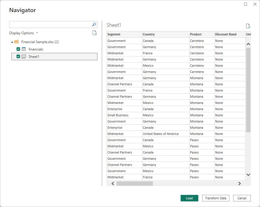 Power BI prompts you to provide the location of the Excel file to which to connect. The downloaded file is called Financial Sample. Select that file, and then select Open.