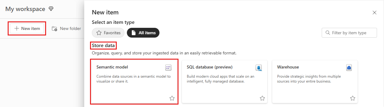In a Power BI workspace, select New item, then under Store data, select Semantic model.