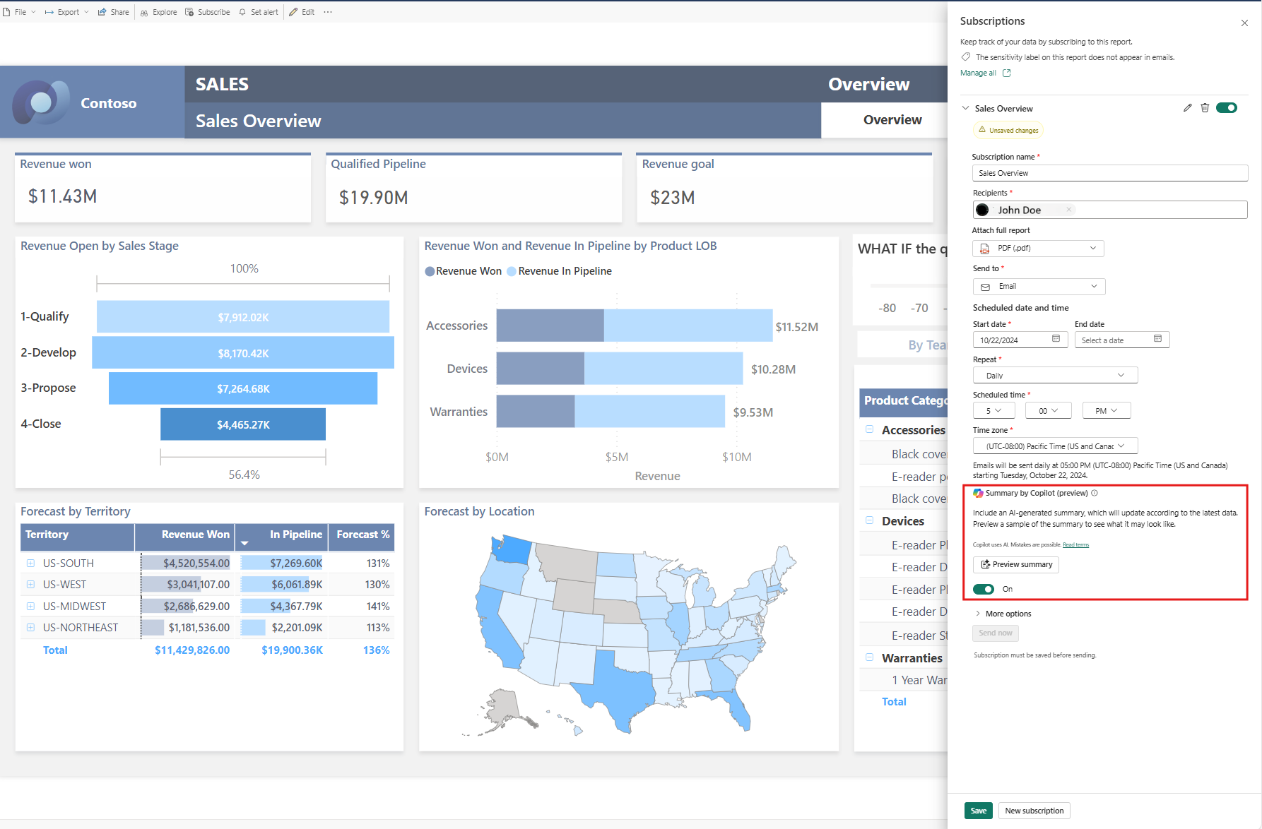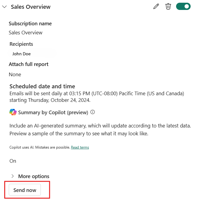 You can include a Copilot generated summary for your Power BI report page or full report attachment in your email subscription to get insights. All the recipients of the email subscription receive the Copilot summary in the email. This feature is currently supported only for Standard Subscriptions.