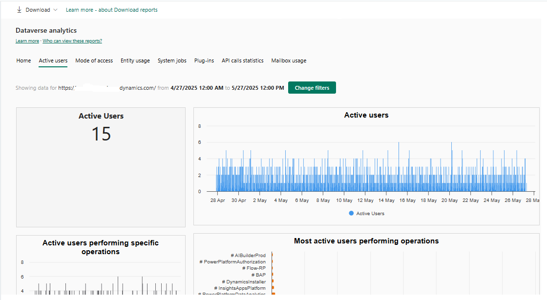 All the download reports, except Active Dynamics 365 Customer Engagement Plan Users by Application, show data for an environment and per the timeline in the filters for the out-of-box Dataverse analytics reports. If you select a certain date range for the out-of-box Dataverse reports, the same time filter applies to the downloads. The maximum duration for data availability is 30 days.