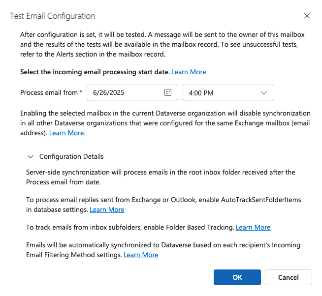 By default, the mailbox configuration is tested and the mailboxes enabled when you select OK.
