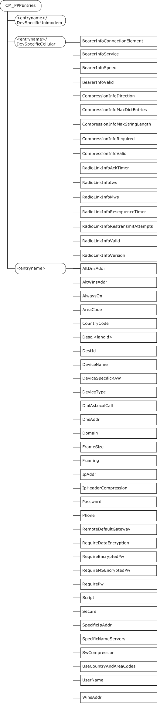 The CM_PPPEntries Configuration Service Provider configures the Point-to-Point Protocol (PPP) entries on the device. Settings for RAS connections are defined in this Configuration Service Provider. GPRS connections are configured using the CM_GPRSEntries connection service provider.