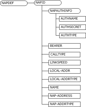 Use the NAPDEF Configuration Service Provider to add, modify, and delete Wireless Application Protocol (WAP) network access points (NAPs) — for example, remote access. For complete information about these settings, see the standard WAP specification WAP-183-ProvCont-20010724-a. For a detailed description of how the device processes these parameters, see the WAP Connectivity Bootstrap Message Example.