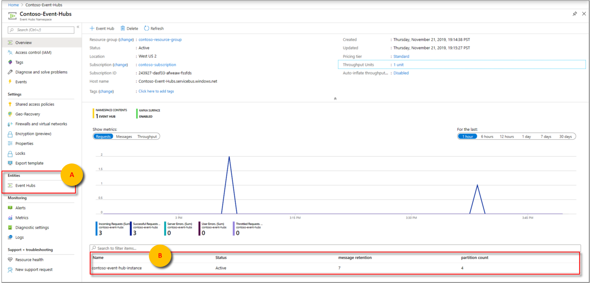 In the Azure portal, locate and open your event hub instance from the Overview pane of your event hub namespace. Select Entities > Event Hubs or find your instance under Name.
