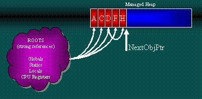 Let's walk through the steps a garbage collector takes during a collection. The GC maintains a list of roots, which point into the GC heap. If an object is live, there is a root to its location in the heap. Objects in the heap can also point to each other. This graph of pointers is what the GC must search through to free up space. The order of events is as follows: