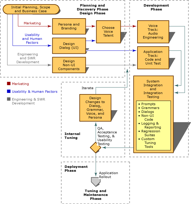 Successful speech application development projects are planned and executed in phases. The phases of a development project reflect an application development lifecycle that begins with planning and discovery, and ends with maintenance and tuning. This model allows a project team to respond to customer requests and to change project direction mid course. It also allows a team to deliver key portions of the product faster than would otherwise be possible.