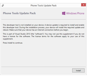 When you connect the Power Tools to a device for the first time, the tools prompt you to install a software update called the Update Pack on the device. This update installs the files required to run Power Tools on the device. These files are also required to run certain other debugging tools, such as the native memory profiler. To conserve space on Windows Phone devices, Microsoft does not install these files by default as part of the operating system.