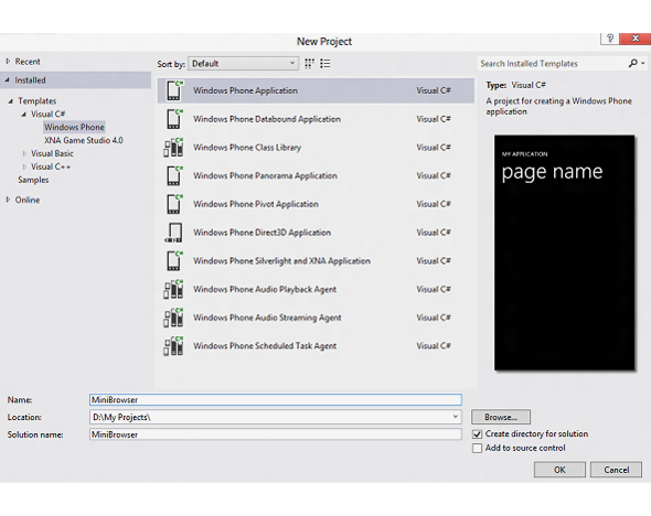 In the New Project window, expand the installed Visual C# or Visual Basic templates, and then select the Windows Phone templates.