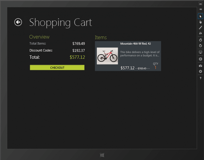 Visual Studio includes a simulator that you can use to run your Windows Store app in various device environments. For example, you can use the simulator to check whether your app works correctly with a variety of screen resolutions and with a variety of input hardware. You can simulate touch gestures even if you're developing the app on a computer that doesn't support touch. The following diagram shows AdventureWorks Shopper running in the simulator.