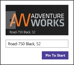 bool isPinned = _secondaryTileService.SecondaryTileExists(tileId);AdventureWorks Shopper calls the PinWideSecondaryTile method in the SecondaryTileService instance to create a secondary tile. The SelectedProduct.ProductNumber property is used as a unique ID.
