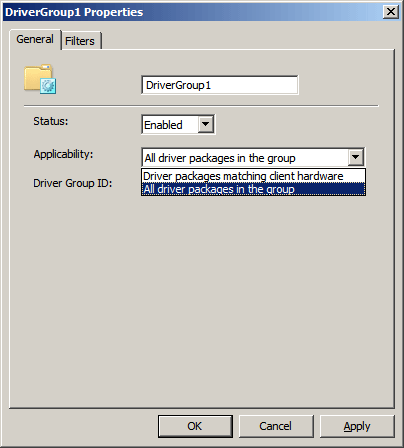 A driver group is a collection of driver packages. You can add filters to a driver group to make the packages in the group available to a select group of client computers. Alternatively, if there are no filters on a driver group, then the packages will be available to all clients that have matching hardware. You can define whether clients that have access to the driver group install either 1) all the packages in the group, or 2) only those packages that match the hardware that is connected to or installed on the client (that is, Plug and Play hardware). |