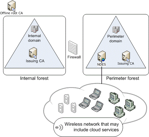 Create a new forest for the server running the Network Device Enrollment Service and the policy module, and the issuing CA. This design creates a security boundary from your internal domain controllers and domain accounts on the intranet, thereby reducing the risk of exposure. See the following diagram for an example of this deployment design that has the following characteristics: