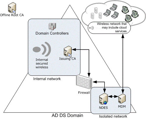 In this design, there is no isolation for the server running the Network Device Enrollment Service and it is a member of the internal domain. The mobile device management software must authenticate all the requests for certificates from the wireless network. For example, this authentication might be to prompt for user name and password. See the following diagram for an example of this deployment design.
