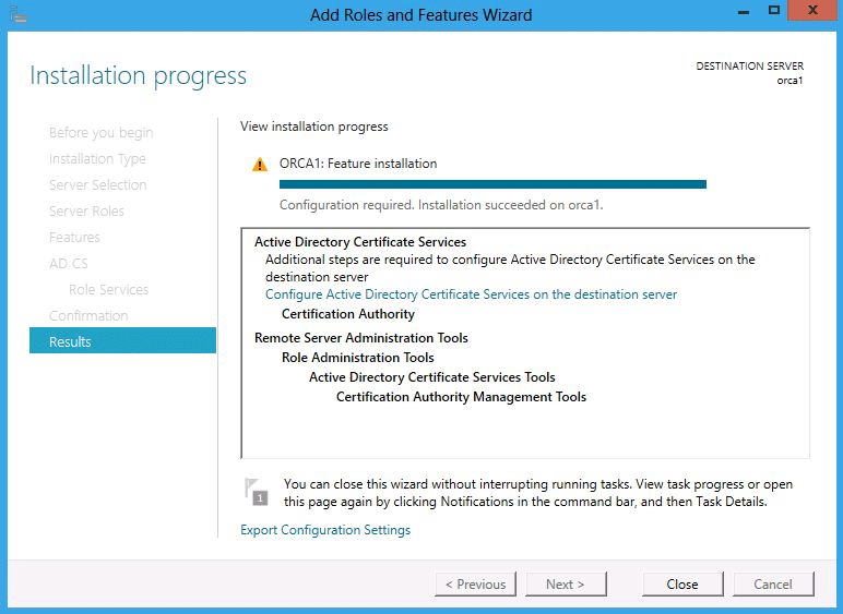 Wait for the installation to complete. The installation progress screen is displayed while the binary files for the CA are installed. When the binary file installation is complete, click the Configure Active Directory Certificate Services on the destination server link.