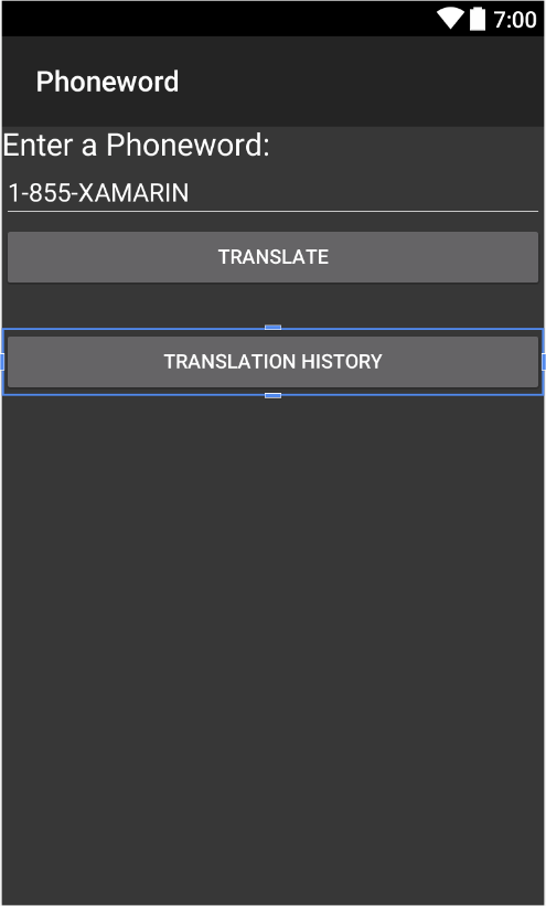 place it below the TranslatedPhoneWord TextView. In the Properties pad, change the button Id to @+id/TranslationHistoryButton: