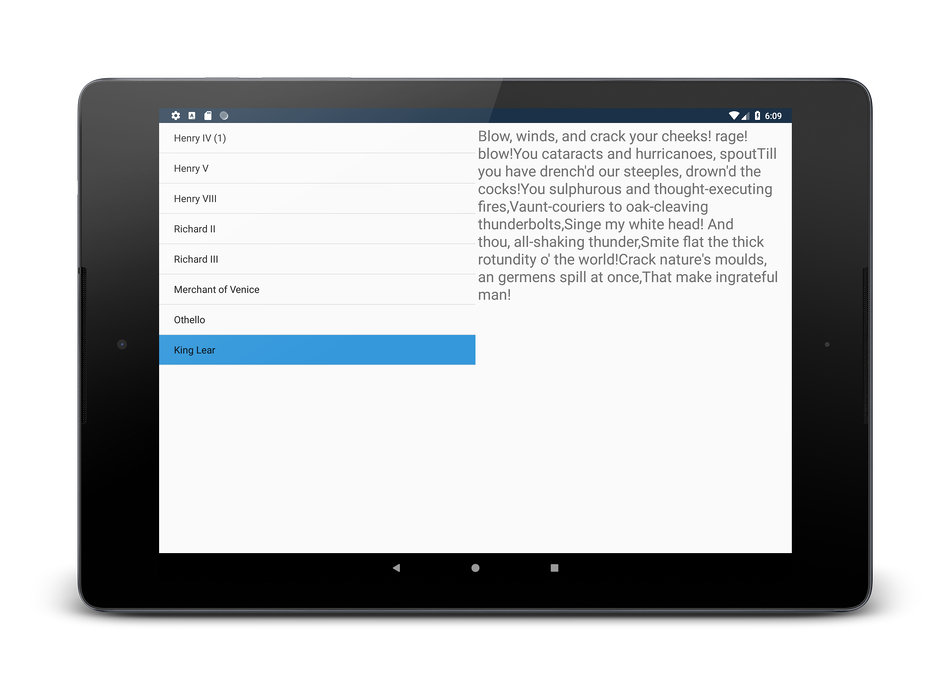 In this section, you'll walk through how to create and use fragments in a Xamarin.Android application. This application will display the titles of several plays by William Shakespeare in a list. When the user taps on the title of a play, then the app will display a quote from that play in a separate activity: