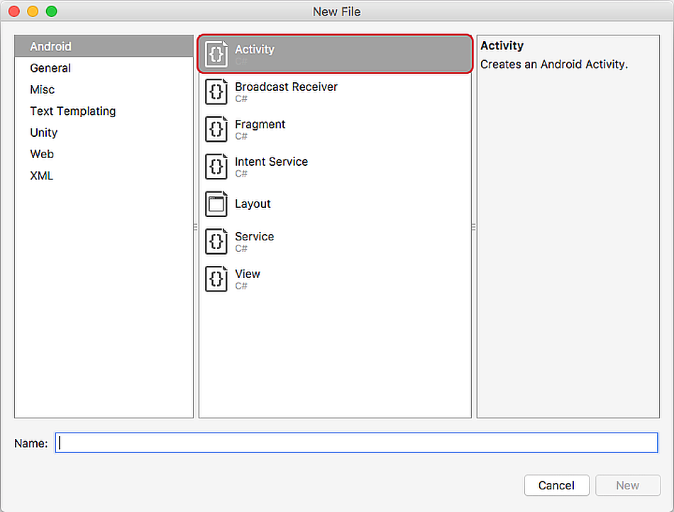 Fragments must be hosted inside an Activity, so this app requires an Activity that will host the PlayQuoteFragment. The Activity will dynamically add the fragment to its layout at run-time. Add a new Activity to the application and name it PlayQuoteActivity: