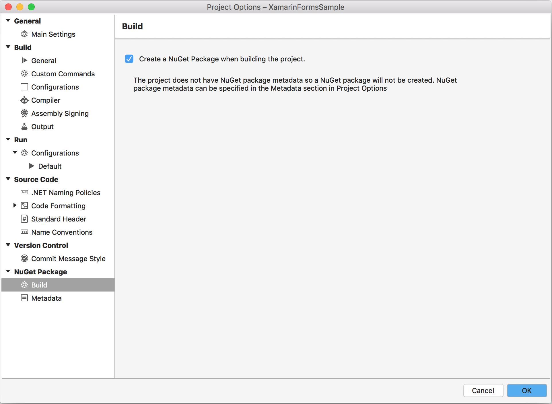 Building the NuGet package can slow down the build process. If this box is not ticked, you can still generate a NuGet package manually at any time from the project context menu (shown in step 4 above).