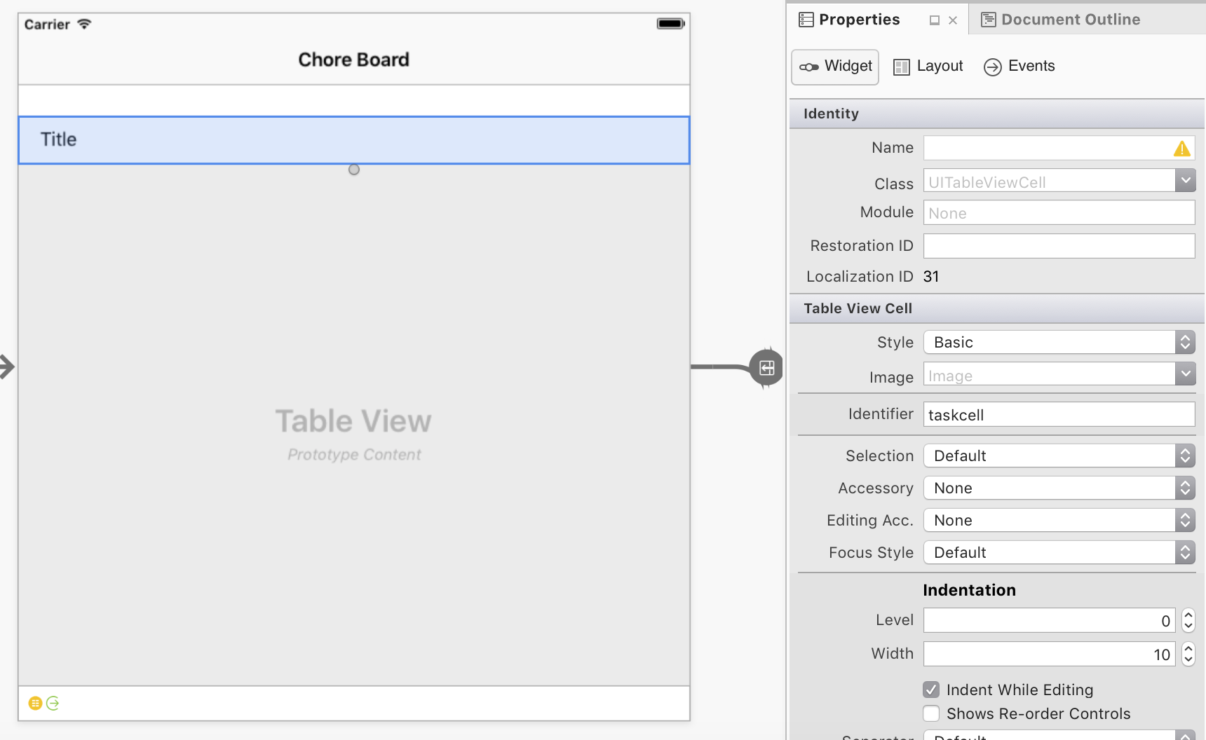 First, select the prototype cell in the Master View Controller and set the Identifier as taskcell, as illustrated below. This will be used later in code to retrieve an instance of this UITableViewCell: