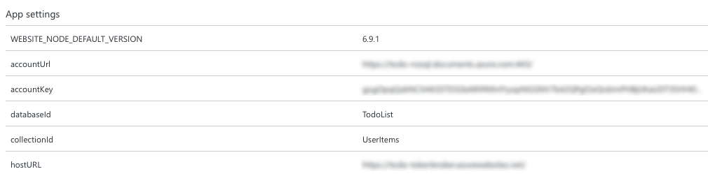 accountUrl– the value should be the Azure Cosmos DB account URL from the Keys blade of the Azure Cosmos DB account.accountKey– the value should be the Azure Cosmos DB master key (primary or secondary) from the Keys blade of the Azure Cosmos DB account.databaseId– the value should be the name of the Azure Cosmos DB database.collectionId– the value should be the name of the Azure Cosmos DB collection (in this case,UserItems).hostUrl– the value should be the URL of the web app from the Overview blade of the App Service account.