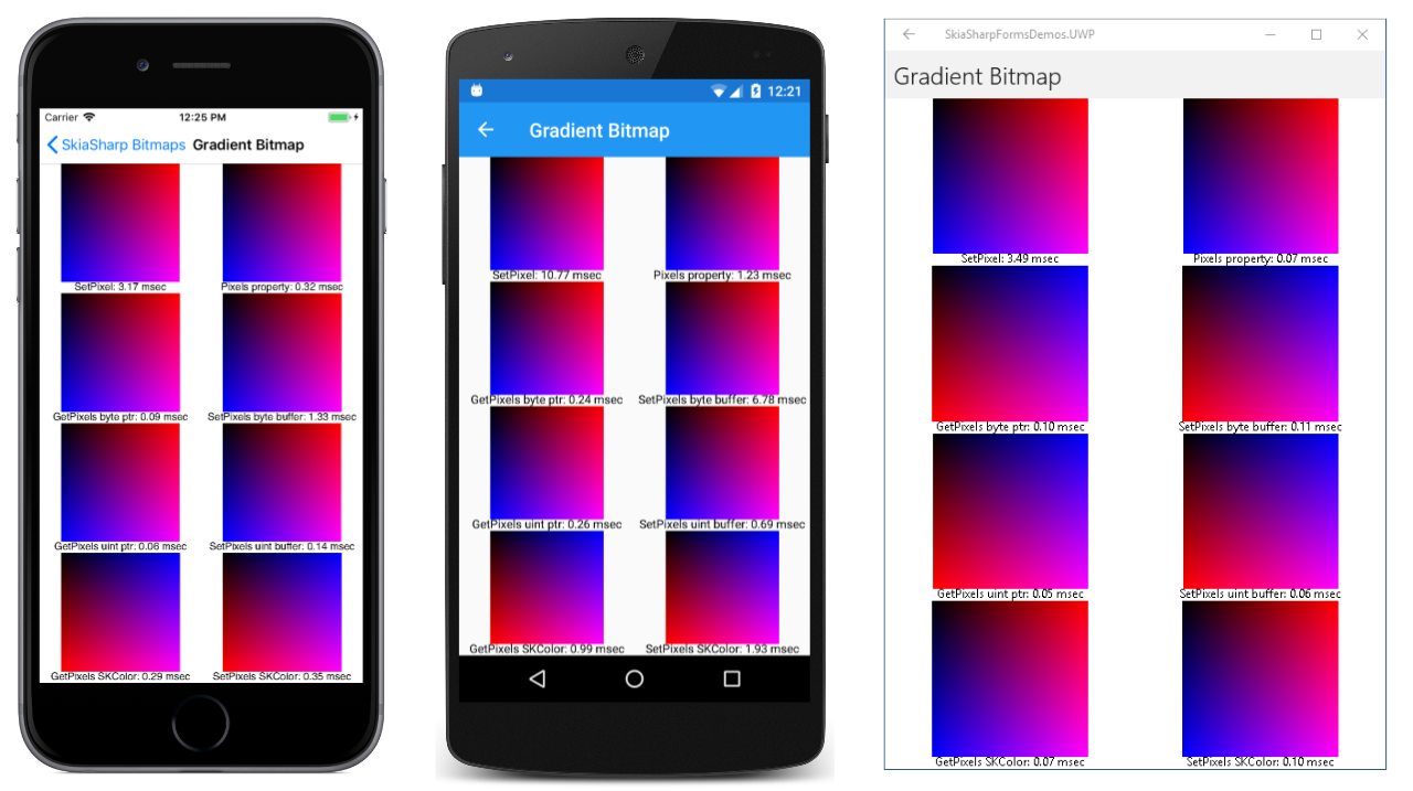 Here's the method in the GradientBitmapPage class that sets the bitmap using the Pixels property. The method allocates an SKColor array of the required size, but it could have used the Pixels property to create that array: