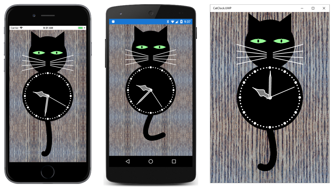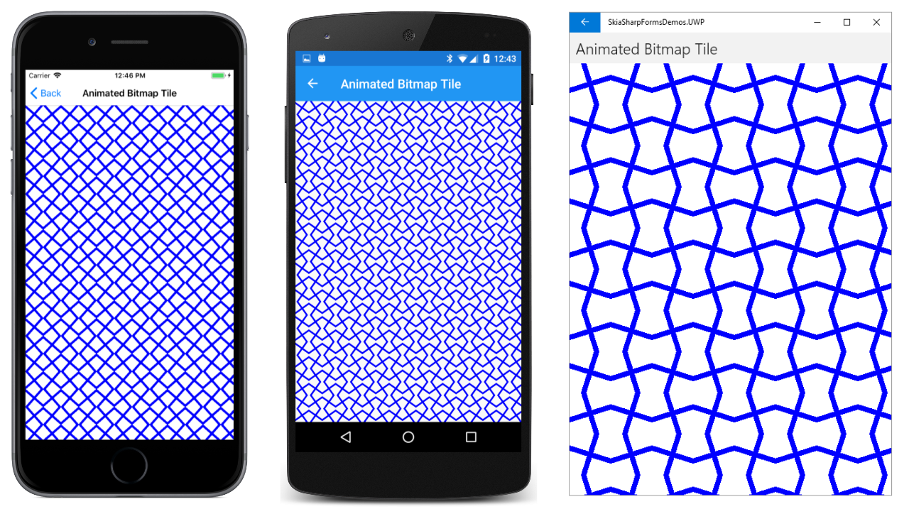 The Android screen in the center shows the result of SKShaderTileMode.Repeat for both arguments. The tile is repeated horizontally and vertically. The Universal Windows Platform screen shows SKShaderTileMode.Mirror. The tiles are repeated but alternately flipped horizontally and vertically. The advantage of this option is that there are no discontinuities between the tiles.