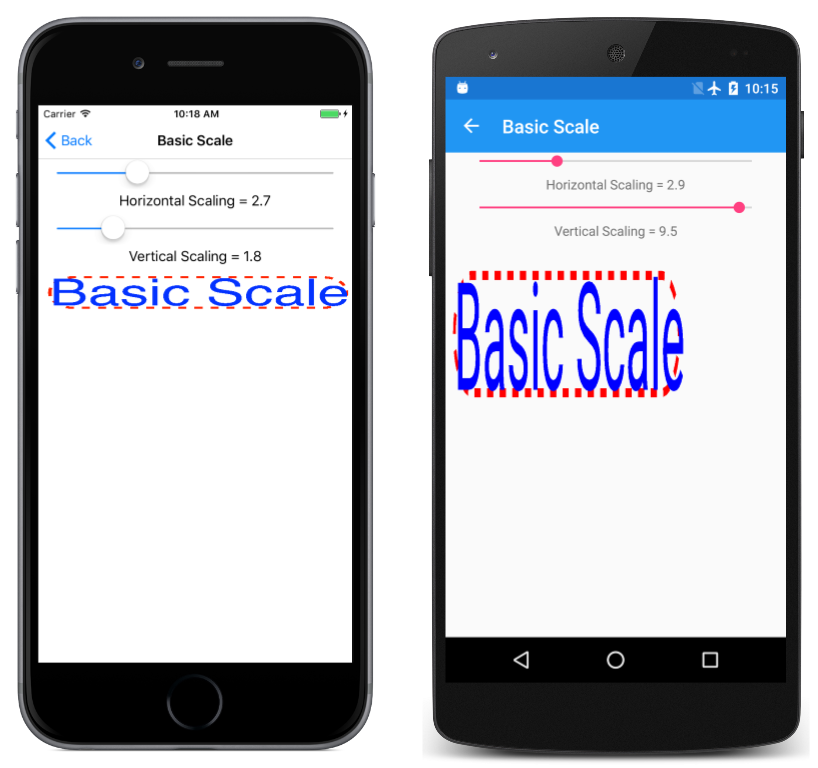 The Basic Scale page demonstrates the Scale method. The BasicScalePage.xaml file contains two Slider elements that let you select horizontal and vertical scaling factors between 0 and 10. The BasicScalePage.xaml.cs code-behind file uses those values to call Scale before displaying a rounded rectangle stroked with a dashed line and sized to fit some text in the upper-left corner of the canvas: