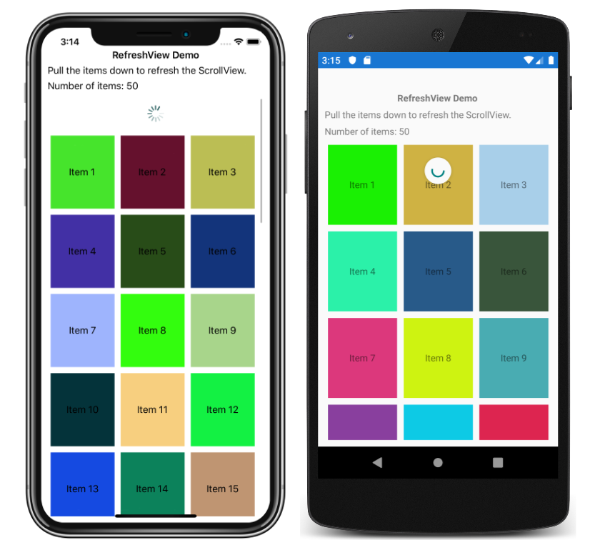 In this example, the RefreshView provides pull to refresh functionality to a ScrollView whose child is a FlexLayout. The FlexLayout uses a bindable layout to generate its content by binding to a collection of items, and sets the appearance of each item with a DataTemplate. For more information about bindable layouts, see Bindable Layouts in Xamarin.Forms.