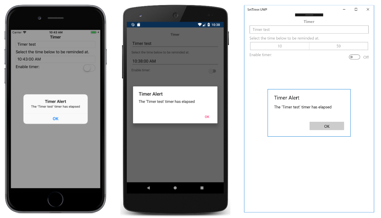 The timer ticks every second, executing the OnTimerTick method that checks whether the Switch is on and whether the current time is greater than or equal to the timer time. When the timer time occurs, the DisplayAlert method presents an alert dialog to the user as a reminder.