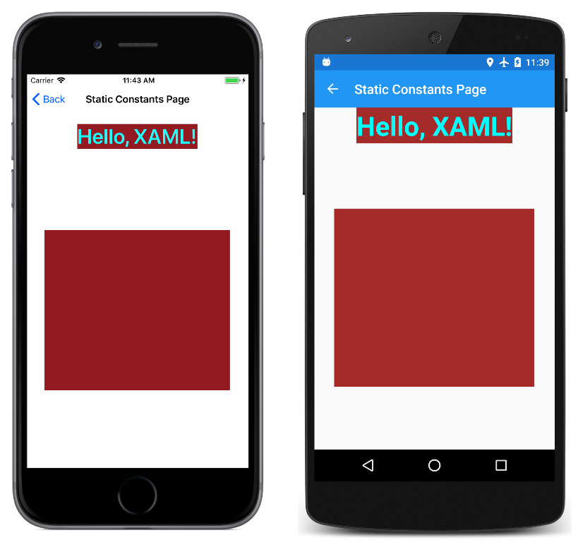 Both these namespace declarations are included in the StaticConstantsPage sample. Notice that the BoxView dimensions are set to Math.PI and Math.E, but scaled by a factor of 100: